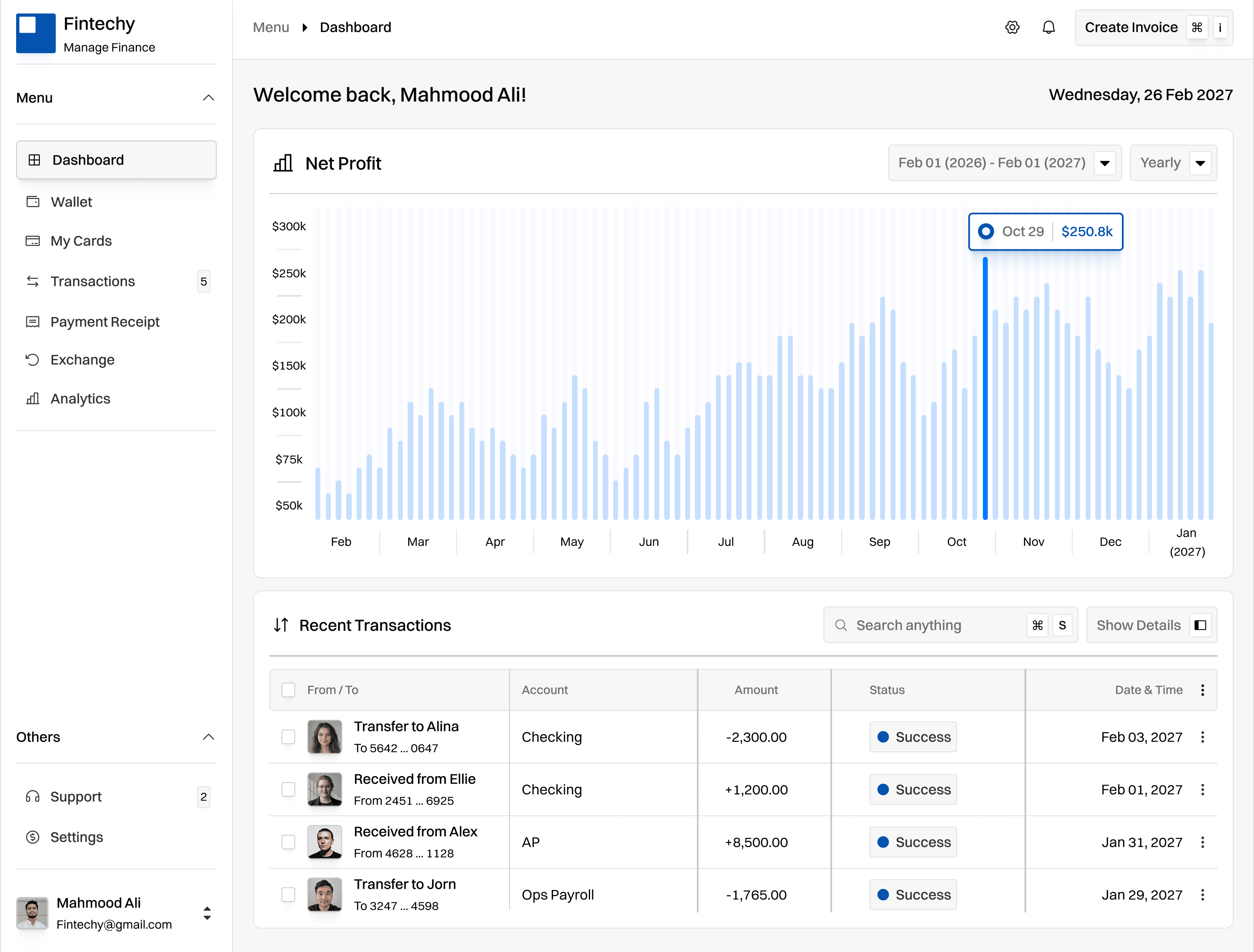 Visualize your net profit over the fiscal year with high-fidelity charts and custom monthly filtration.